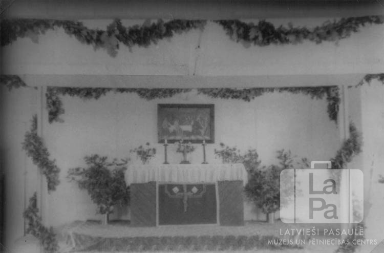 Latviešu baznīca altāris Vēdeles nometnē (angļu zonā) baznīcas iesvētīšanas dienā. Altāris gaišajā telpā ir novietots uz paaugstinājuma un apvīts ar ozolu vītnēm. Uz tā ir divi svečturi ar vienu sveci katrā un ziedi vāzēs. Aiz altāra ir glezna.