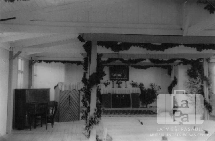 Latviešu baznīca altāris Vēdeles nometnē (angļu zonā) baznīcas iesvētīšanas dienā. Gaiša telpa, kreisajā pusē ir klavieres un mācītāja kancele. Vidū, telpas dziļumā, ir altāris. Baznīcas iekšpuse ir dekorēta ar ozolu vītnēm, kas aptītas ap kolonnām un stiepjas pa griestiem.