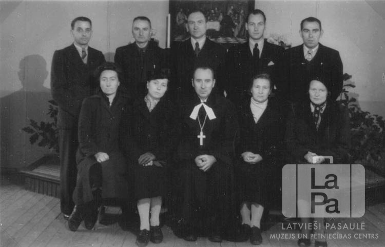 Desmit cilvēku grupas fotogrāfija altāra priekšā. Vidū sēž mācītājs.