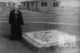 Mācītājs stāv ārā,zālājā, pie zemē izlikta Latvijas gērboņa. Fonā koka barakas.