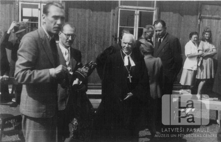 Cilvēku grupa baznīcas priekšā tās iesvētīšanas dienā Vēdeles nometnē (angļu zonā). Fonā koka māja ar diviem logiem. Vidū ir redzams: Edgars Bergs (prāvests, savā amata tērpā).