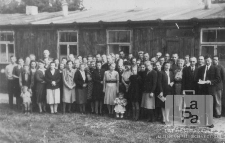Nometnes iedzīvotāji pie vienstāvu koka barakas Vēdelē (angļu zonā). Liela cilvēku grupa, visi stāv kājās.