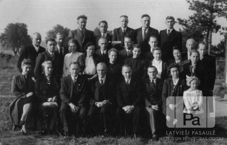 Draudzes darbinieku grupa Vēdeles nometnē (angļu zonā) profesora K. Kundziņa viesošanās reizē. Fonā koki. Pirmajā rindā, no kreisās: otrā Alīde Zariņa, piektais Edgars Lange (mācītājs). Grupā vēl redzams: Edgars Zariņš.