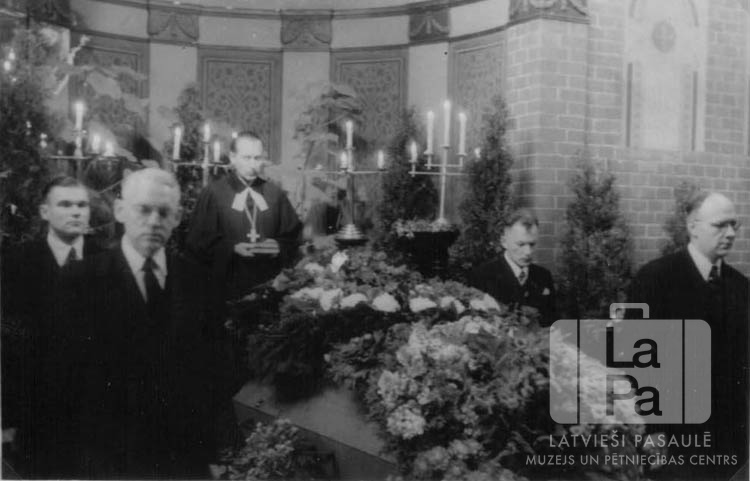 Godasardze K. Zāles bērēs pie viņa zārka kapličā Vēdelē (angļu zonā) 1946. gada rudenī. Zārks ir noklāts ar ziediem, abās pusēs tam stāv četri vīri, aiz zārka stāv mācītājs. Fonā deg sveces svečturos, gar sienu ir novietotas tūjas. Zārka galā: Edgars Lange (mācītājs).