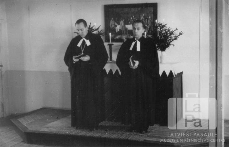 Divi mācītāji stāv altāra priekšā Vēdeles nometnē (angļu zonā). Uz altāra ir svečturi ar aizdegtām svecēm, arī egļu zari vāzēs ar saspraustām, aizdegtām svecēm. Virs altāra ir glezna. No kreisās: Edgars Lange (mācītājs) un M. Preikšailis (lietuviešu mācītājs).