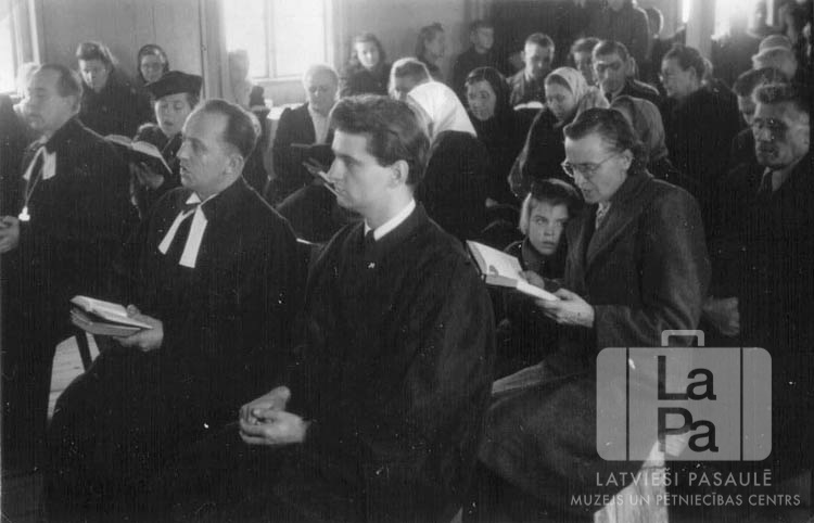 Mācītāji un draudze sēž baznīcā latviešu, lietuviešu un igauņu evaņģēliski luterisko draudžu kopīgā dievkalpojumā Vēdeles nometnē (angļu zonā) ar Pasaules luterāņu federācijas pārstāvja mācītāja H. Brokeringa piedalīšanos. Priekšā sēž, no kreisās: pirmais Edgars Lange (mācītājs amata tērpā), otrais M. Preikšailis (lietuviešu mācītājs), trešais H. Brokerings.
