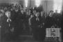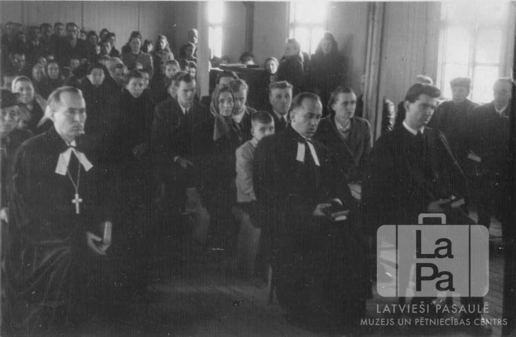 Mācītāji un draudze sēž baznīcā latviešu, lietuviešu un igauņu evaņģēliski luterisko draudžu kopīgā dievkalpojumā Vēdeles nometnē (angļu zonā) ar Pasaules luterāņu federācijas pārstāvja mācītāja H. Brokeringa piedalīšanos. Priekšā sēž, no kreisās: pirmais Edgars Lange (mācītājs amata tērpā), otrais M. Preikšailis (lietuviešu mācītājs), trešais H. Brokerings.