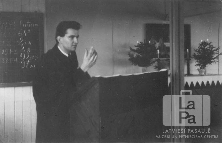 Pasaules luterāņu federācijas pārstāvis mācītājs H. Brokerings (stud. theol.) sprediķo pie kanceles latviešu, lietuviešu un igauņu evaņģēliski luterisko draudžu kopīgā dievkalpojumā Vēdeles nometnes baznīcā (angļu zonā). Fonā, kreisajā pusē, ir tāfele. Fonā, labajā pusē, ir altāris, uz altāra ir svečturi ar aizdegtām svecēm, arī egļu zari vāzēs ar saspraustām, aizdegtām svecēm. Virs altāra ir glezna.
