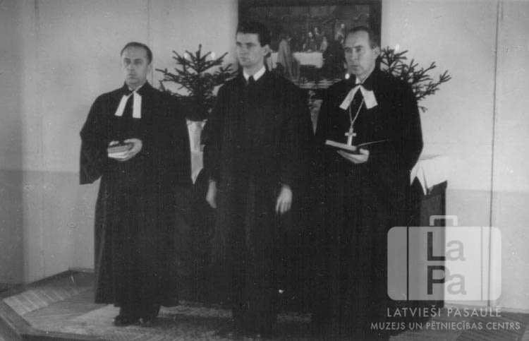Mācītāji altāra priekšā baznīcā latviešu, lietuviešu un igauņu evaņģēliski luterisko draudžu kopīgā dievkalpojumā Vēdeles nometnē (angļu zonā) ar Pasaules luterāņu federācijas pārstāvja mācītāja H. Brokeringa piedalīšanos. Aizmugurē ir altāris, uz altāra ir svečturi ar aizdegtām svecēm, arī egļu zari vāzēs ar saspraustām, aizdegtām svecēm. Virs altāra ir glezna. No kreisās: M. Preikšailis (lietuviešu mācītājs), Edgars Lange (mācītājs), H. Brokerings (stud. theol.).