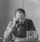 Komandants V. Vadre runā pa telefonu Vēdeles nometnē (angļu zonā). Vīrietis ir ģērbies formastērpā un sēž pie galda. Fonā ir koka dēļu siena.