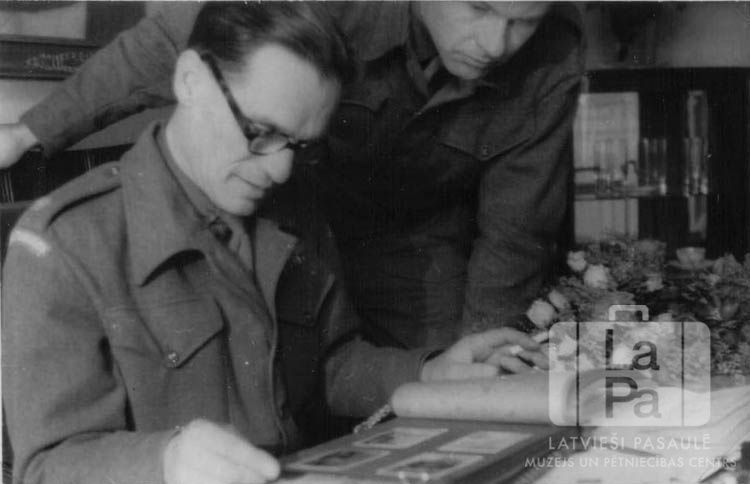 Majors kopā ar komandantu no Vēdeles nometnes (angļu zonā) pēta albumu. Priekšā, uz galda, ir ziedi un dokumenti. No kreisās: ? Barets (majors Halstenbekā), V. Vadre (Vēdeles nometnes komandants).