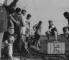 Skauti sporto tāllēkšanas nodarbībā Vēdeles nometnē (angļu zonā). Viens jaunietis lec, pārējie cilvēki stāv apkārt un noskatās. Kreisajā pusē viens vīrietis ir atspiedies pret grābekli. Fonā plašs lauks.