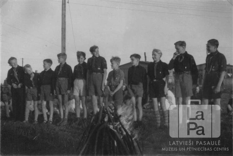 Kokneses 46. skautu vienība formastērpos stāv rindā skautu ugunskura vakarā Vēdeles nometnē (angļu zonā). Priekšā deg ugunskurs. Fonā ir vienstāvu koka barakas.