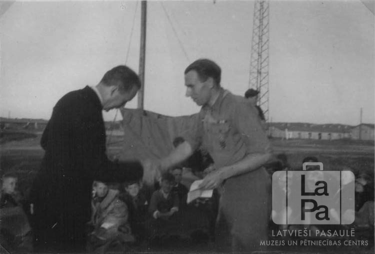 Divi vīri sarokojas Kokneses 46. skautu vienības skautu ugunskura vakarā Vēdeles nometnē (angļu zonā). Viens vīrietis ir ģērbies uzvalkā, otrs – skautu formastērpā. Aizmugurē bērni sēž uz zemes. Fonā ir augsts koka stabs, dzelzs tornis, plašs lauks un vienstāvu koka barakas. Priekšā, labajā pusē stāv: Roberts Grauds (Kokneses 46. skautu vienības priekšnieks, vadītājs).
