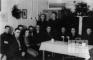 Organizācijas "YMCA" biedri savās telpās Vēdeles nometnē (angļu zonā). Telpas vidū ir galds, cilvēki ir sasēdušies tam apkārt. Telpas sienas ir dekorētas ar egļu zariem. Aiz galda, uz sienas, egļu ietvarā, ir Latvijas valsts karogs. Pirmais no labās: Jānis Immurs.