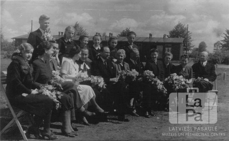 Skolēni un skolotāji latviešu tautskolas izlaidumā Elmshornas nometnē (angļu zonā). Pirmajā rindā skolotāji sēž uz krēsliem, otrajā skolēni stāv kājās. Vairākiem cilvēkiem rokās ir ziedi. Fonā nometnes vienstāvu koka baraka. Priekšā sēž, no kreisās: pirmā ? Augenberga (skolotāja), trešais Jānis Taube (nometnes komendants), ceturtā Elvīra Brūns (skolotāja), piektais Edgars Lange (mācītājs), sestais Eižens Leimanis (skolas pārzinis) un astotais Jānis Brūns. Aizmugurē, no kreisās: Pēteris Krūmiņš, Maija Zariņa, Dzidra Polis, Ivete Priede, ? Jaunzeme un Guntis Brūns.