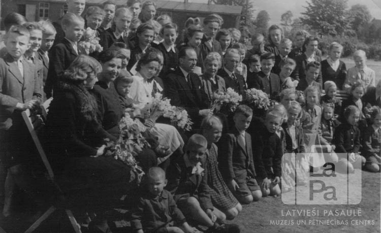 Skolēni un skolotāji latviešu tautskolas izlaidumā Elmshornas nometnē (angļu zonā). Pirmajā rindā skolēni sēž uz zemes, otrajā rindā skolotāji sēž uz krēsliem, aizmugurē skolēni stāv kājās. Vairākiem cilvēkiem rokās ir ziedi. Fonā nometnes vienstāvu koka baraka. Otrajā rindā ir redzami: ? Augenberga (skolotāja), Jānis Taube (nometnes komendants), Elvīra Brūns (skolotāja), Edgars Lange (mācītājs), Eižens Leimanis (skolas pārzinis) un Jānis Brūns. Trešajā rindā ir redzami: Pēteris Krūmiņš, Maija Zariņa, Dzidra Polis, Ivete Priede, ? Jaunzeme un Guntis Brūns.
