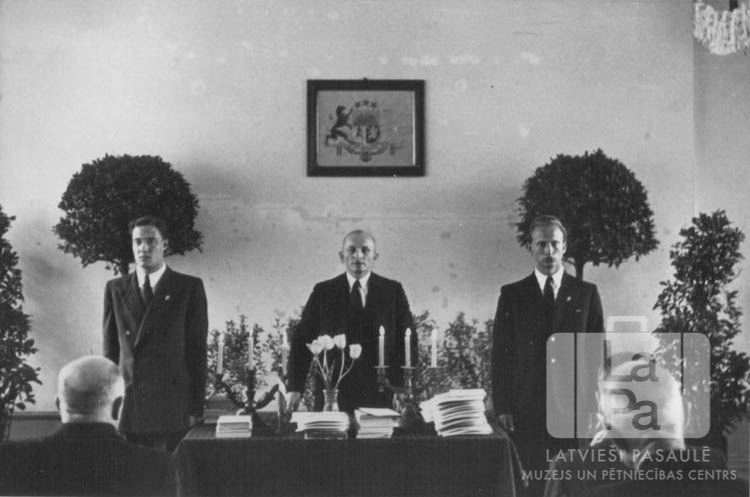 Trīs vīrieši stāv pie prezidija galda ar papīriem, ziediem, svecēm. Fonā dekoratīvi koki un Latvijas ģērbonis.