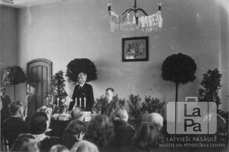 Vīrietis stāv aiz prezidija galda latviešu ģimnāzijas izlaiduma svinīgajā aktā Pinnebergas nometnē (angļu zonā). Uz galda ir dokumenti, tulpes vāzē un aizdegtas sveces. Priekšplānā ir redzami skatītāji. Fonā, gar telpas malām, ir dekoratīvi koki, pie sienas ir Latvijas ģerbonis. No griestiem karājas lustra.
