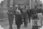 Cilvēku grupa pa bruģētu ielu dodas uz Toma baznīcu arhibīskapa Teodora Grīnberga vizītes laikā Lībekā (angļu zonā). Fonā ir mūra ēka. Priekšplānā, no kreisās: ? Ramans (mācītājs, ar sakrustotām rokām), Teodors Grīnbergs (ar ziediem rokās) un Edgars Lange (mācītājs, ar pārmestu mēteli pāri rokai).
