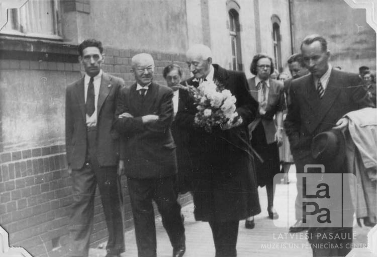 Cilvēku grupa pa ielu dodas uz Toma baznīcu arhibīskapa Teodora Grīnberga vizītes laikā Lībekā (angļu zonā). Fonā ir mūra ēka. Priekšā, no kreisās: pirmais A. Ķelle (mācītājs), otrais ? Ramans (mācītājs, ar sakrustotām rokām), trešais Teodors Grīnbergs (ar ziediem rokās) un ceturtais Edgars Lange (mācītājs, ar pārmestu mēteli pāri rokai).