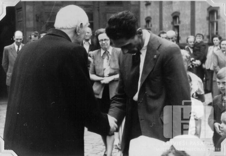 Divi vīrieši sarokojas uz ielas arhibīskapa Teodora Grīnberga vizītes laikā Lībekā (angļu zonā). Apkārt stāv pieaugušie un bērni. Fonā ir ķieģeļu ēkas. Pirmais no kreisās: Teodors Grīnbergs.