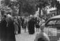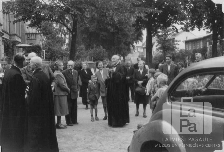 Cilvēku grupa stāv uz ielas arhibīskapa Teodora Grīnberga vizītes laikā Lībekā (angļu zonā). Kreisajā pusē un vidū stāv garīdznieki amata tērpos. Priekšā, labajā pusē, ir automašīna "Volkswagen Beetle". Fonā ir koki un vairākas mūra ēkas. Priekšplānā, kreisajā pusē, ir redzams ? Ramans (mācītājs, ar grāmatām rokās). Vidū ir redzams: Teodors Grīnbergs.