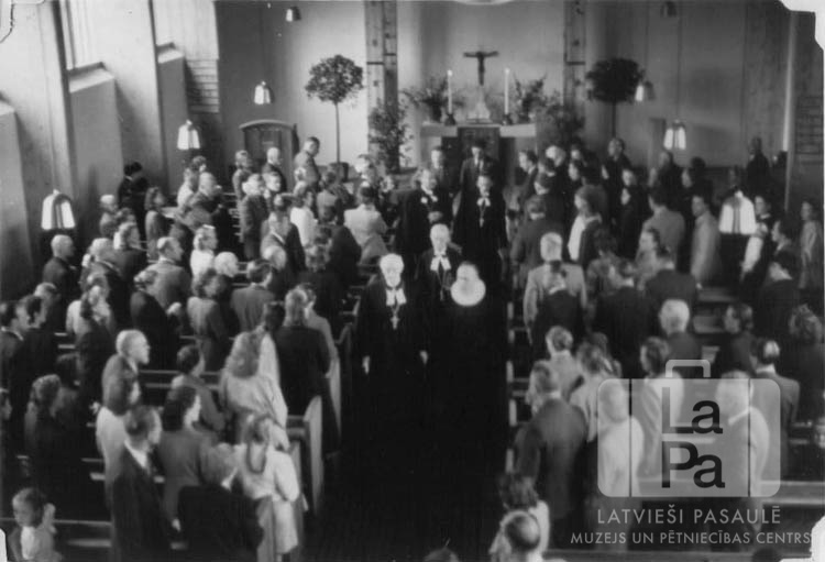 Latviešu dievkalpojums Toma baznīcā Lībekā (angļu zonā). Telpā stāv draudze, pa galveno eju starp soliem prom no altāra dodas garīdznieku procesija amata tērpos. Baznīcas galā ir altāris un liels, apaļš logs.