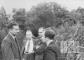 Četri vīrieši sarunājas mācītāju konferences laikā Raceburgā (angļu zonā) 1951. gada 30.–31. augustā. Apkārt ir gara zāle, fonā – mežs. No kreisās: pirmais J. Urdze, otrais Edgars Lange, trešais nezināms, ceturtais ? Bergensens.
