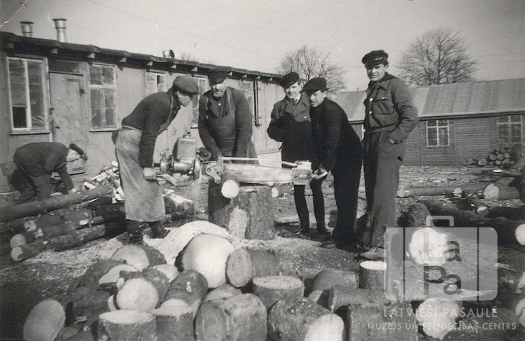 Seši vīri pie malkas sagatavošanas. Priekšplānā bluķi, fonā barakas.