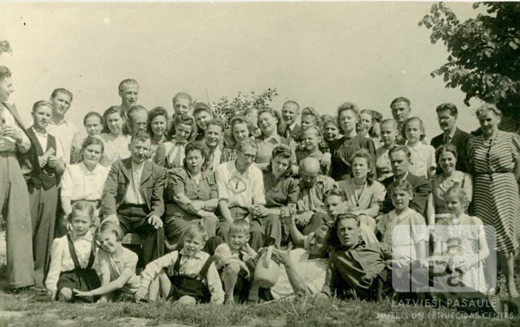 Artūra un Rasmas Cipuļu kāzu dienas draugi un viesi Braunšveigā (angļu zonā). Pirmajā rindā, no kreisās: Dace Kica, Margiņa Karpa, Māris Birzgalis, Indris Eidemanis, Nikolajs Andersons (gaišā kreklā ar groziņu (?) rokā) nezināms, aiz viņiem Olģerts Kics, Vijua Karpa un Iza Lintiņa (abas gaišās kleitās). Otrajā rindā sēž, no kreisās: Līna Kics, Nikolajs Kics, ? Goba, Artūrs un Rasma Cipuļi, ? Goba, Aina Hertele, Eduards Tauriņš un Lilija Tauriņa. Trešajā rindā, no kreisās: Indulis Zviedris, Arvīds Treimanis, Kārlis Kociņš, ? Lintiņa, Mirdza Birzniece, Imants Rambachs, Jānis Lukstiņš, Ida Kola, ? Karps, ? Nikiforovs, Nina Nikiforova, Aleksandrs Zasters, Aina Oša, Livija Lagzdiņa, Arturs Neparts, Austra Tauriņa, nezināms, Aina Tauriņa (pr. Caune), Ligita Birzgale, Inta Birzgale, Mārtiņs Ozoliņš un ? Eidemane (?).