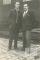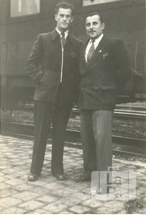 Divi vīrieši uzvalkos stāv pie vilciena Šveinfurtē (amerikāņu zonā) 1951. gada pavasarī. No kreisās: Arvīds Mačs un Alfreds Mačs (brālēni). Foto autors: Elza Mačs (dz. Silarājs).