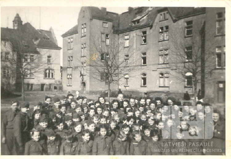 Skauti un gaidas formastērpos pie trīsstāvu mūra ēkas Vīsbādenes nometnē (amerikāņu zonā). Fonā trīs koki bez lapām; kreisajā pusē redzama gaiša divstāvu mūra ēka.