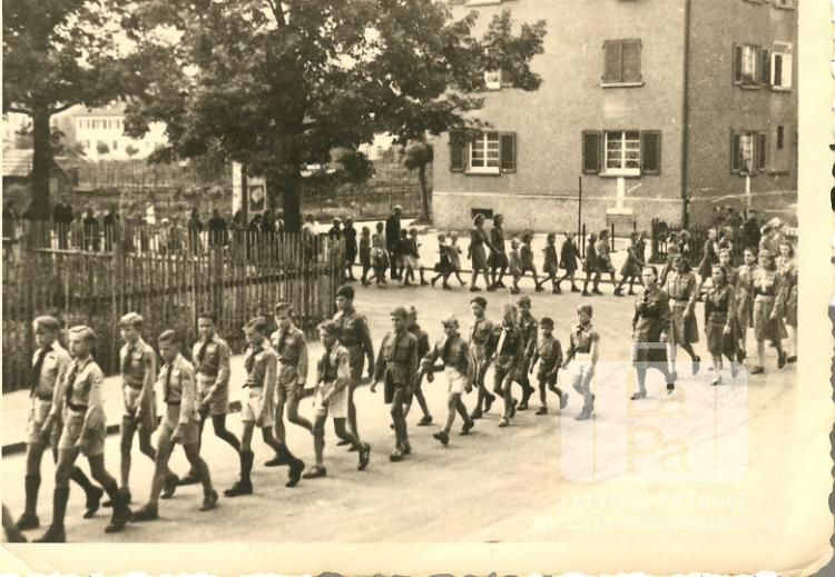 Skauti un gaidas formastērpos dodas gājienā pa ielu Švābu Gmindē (amerikāņu zonā). Kreisajā pusē koka žogs, labajā pusē vairākstāvu mūra ēka. Foto autors: Genis Zelčs. Par šo gadījumu Genis Zelčs atceras: "Skauti un gaidas, kā arī privāti cilvēki, ejot uz satikšanos ar lietuviešiem, lai piedalītos demonstrācijā pret Padomju Savienības nelegālo Baltijas valstu okupāciju un par Baltijas valstu brīvību. Cik zinu, šādas demonstrācijas notika baltiešu nometnēs visā amerikāņu zonā tajā pašā dienā, lai pasaulei būtu lielāks iespaids. Nevienam nebija ilūziju, ka krievi atstās mūsu zemes, bet vismaz parādījām, ka mēs neesam ar to samierinājušies un ceram, ka kādreiz tās atkal būs brīvas valstis."