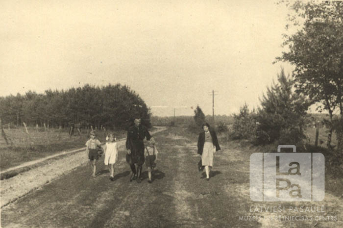 Rītiņi iet pa lauku ceļu Minsterē (angļu zonā). Apbus ceļam lauki un meži. No kreisās: trešais Genriks Rītiņš, piektā Emīlija Rītiņa.