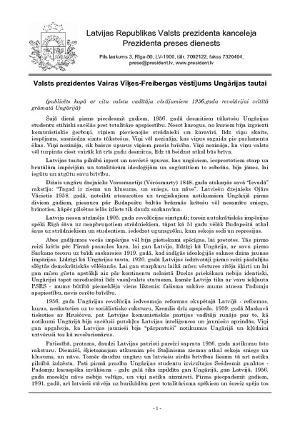 Valsts prezidentes Vairas Vīķes-Freibergas vēstījums Ungārijas tautai