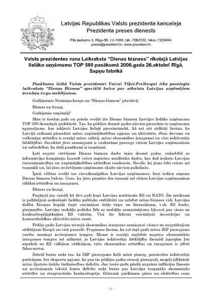 Valsts prezidentes runa Laikraksta “Dienas bizness” rīkotajā Latvijas lielāko uzņēmumu TOP 500 pasākumā 2006.gada 26.oktobrī Rīgā, Sapņu fabrikā
