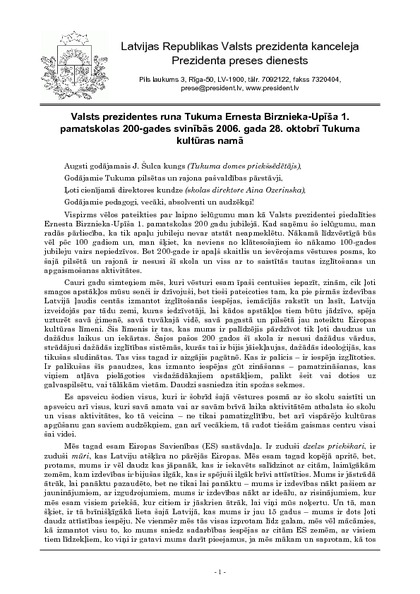 Valsts prezidentes runa Tukuma Ernesta Birznieka-Upīša 1. pamatskolas 200-gades svinībās 2006. gada 28. oktobrī Tukuma kultūras namā