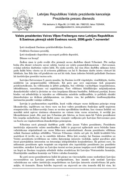 Valsts prezidentes Vairas Vīķes-Freibergas runa Latvijas Republikas 9.Saeimas pirmajā sēdē Saeimas namā, 2006.gada 7.novembrī