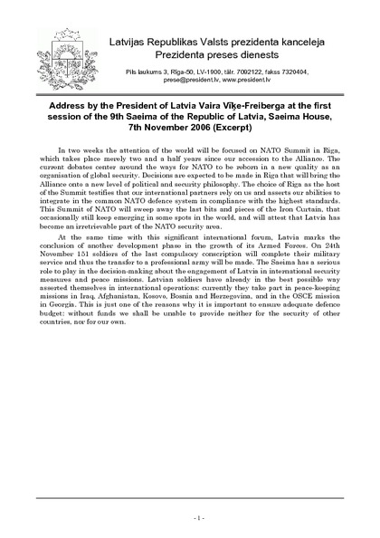 Address by the President of Latvia Vaira Vīķe-Freiberga at the first session of the 9th Saeima of the Republic of Latvia, Saeima House, 7th November 2006 (Excerpt)