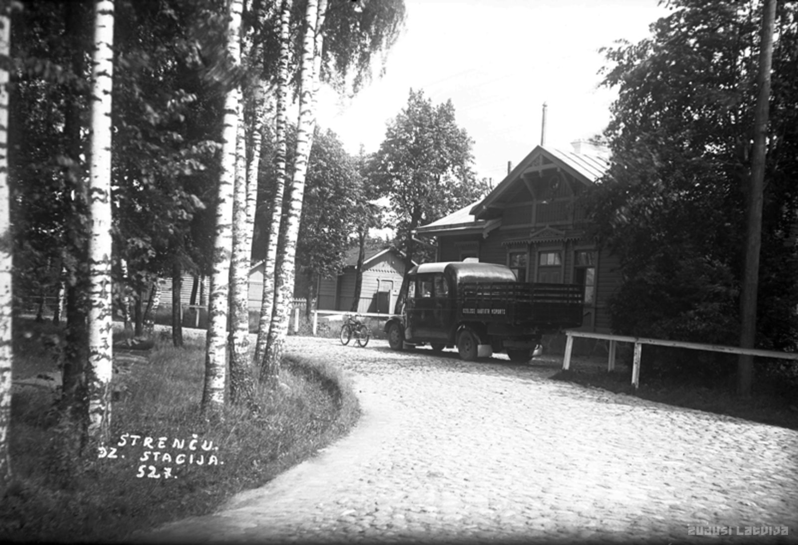 Strenču dzelzsceļa stacija ierīkota 1889. gadā līdz ar dzelzceļa līnijas Rīga - Valka atklāšanu. Stacijas sākotnējais nosaukums Stakeln. Kopš 1919. gada stacijas nosaukums ir Strenči. 50. gadu otrajā pusē jaunas kūdras fabrikas būves dēļ no stacijas izbūvēts atzarojums uz kūdras krautuvi