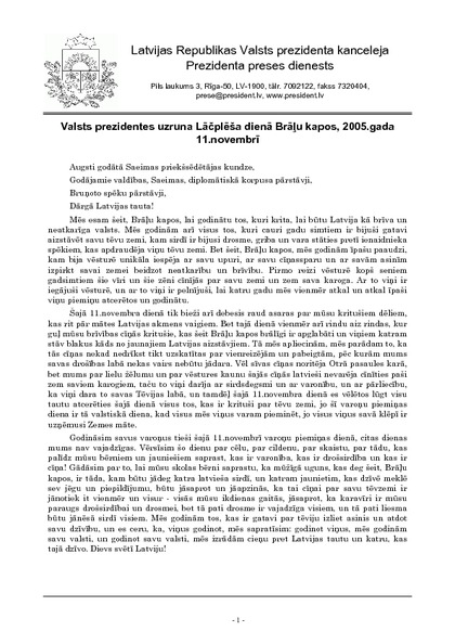 Valsts prezidentes uzruna Lāčplēša dienā Brāļu kapos, 2005.gada 11.novembrī