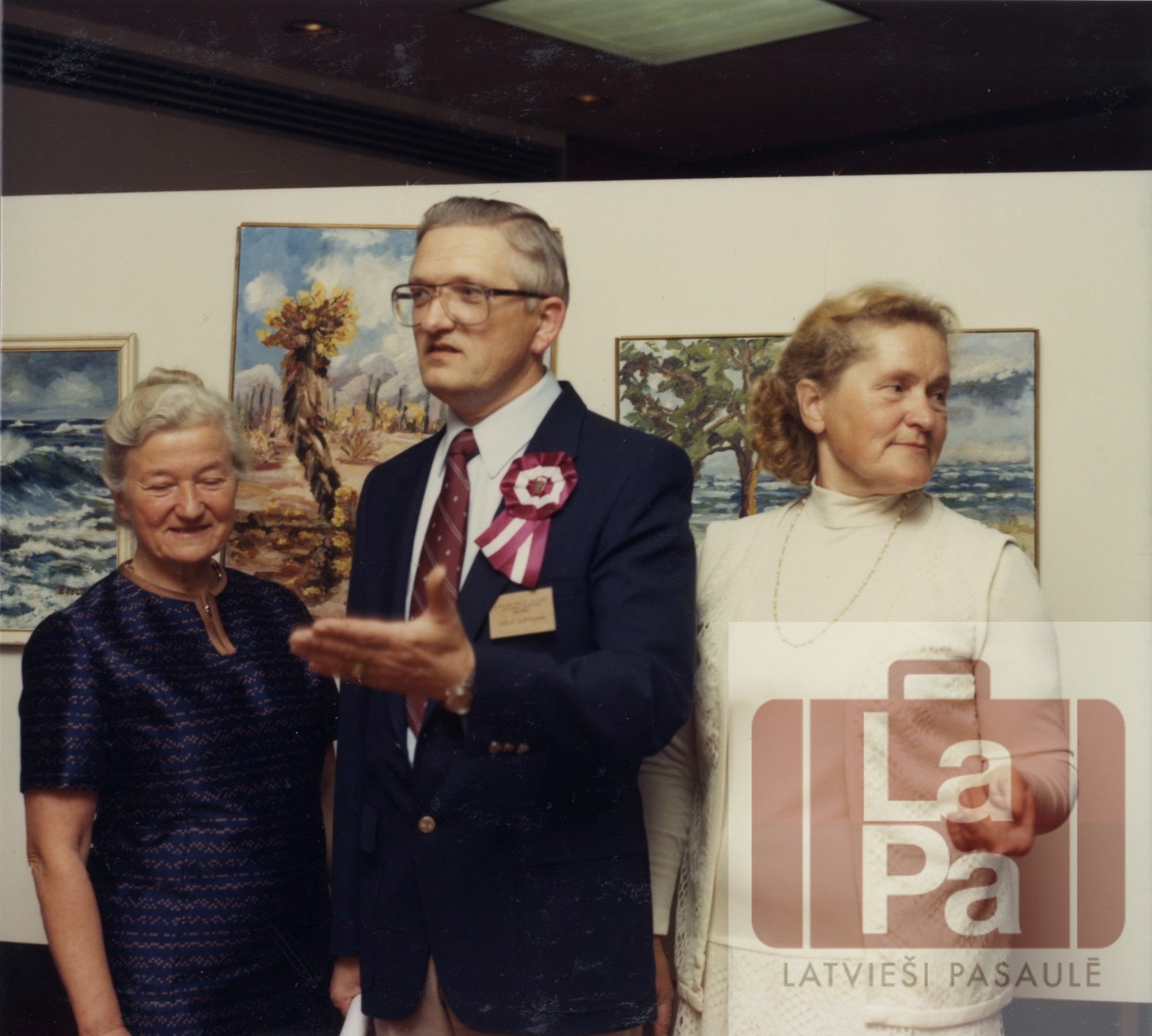 9. Rietumkrasta Dziesmu svētki Portlendā, Oregonā, ASV no 1982. gada 30. jūnija līdz 5. jūlijam. No kreisās: Aina Pamovska, Juris Jurisons, Lidija Balode atklāj gleznu izstādi.