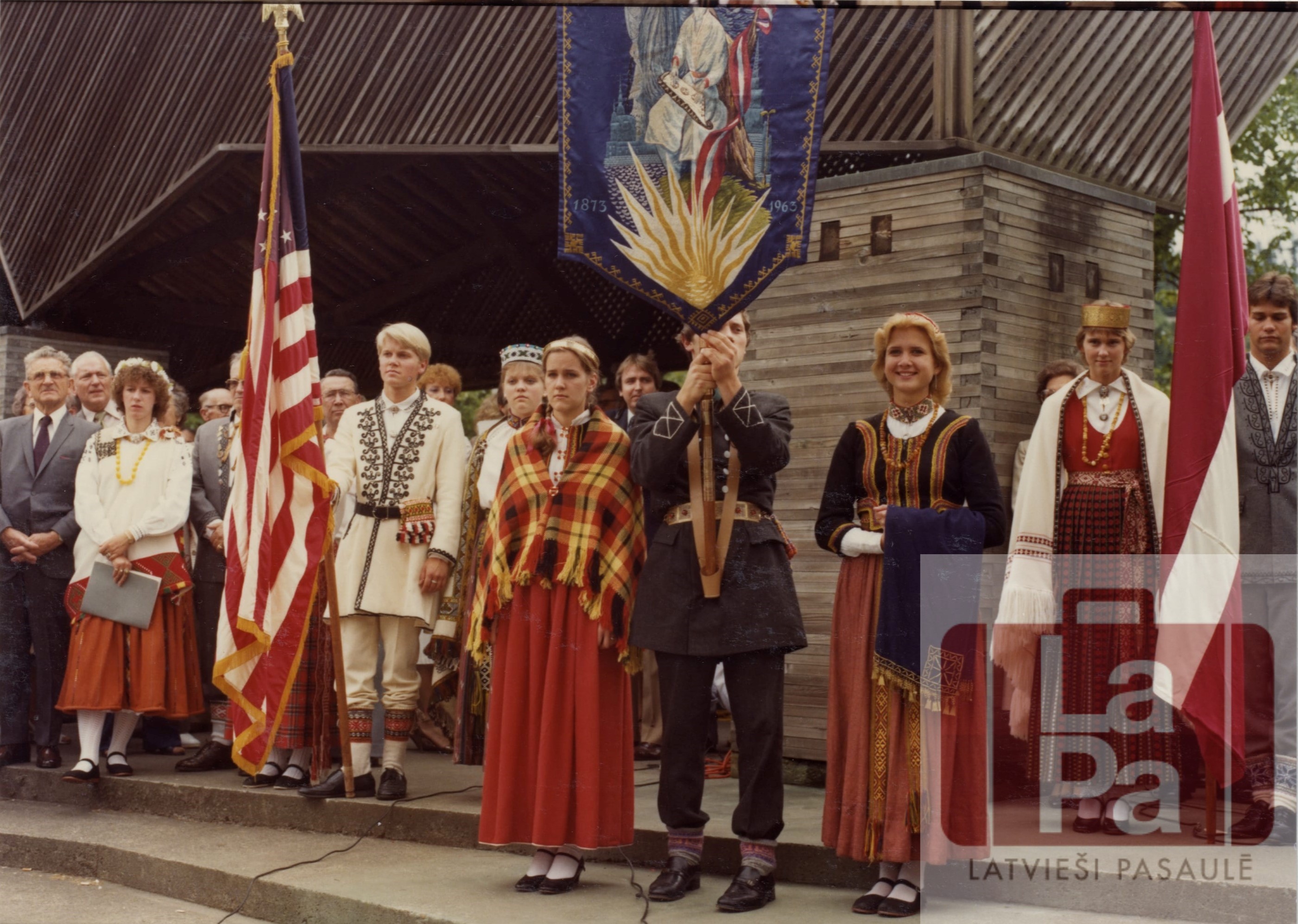 9. Rietumkrasta Dziesmu svētki Portlendā, Oregonā, ASV no 1982. gada 30. jūnija līdz 5. jūlijam. Pirms svētku gājiena pie karogiem.