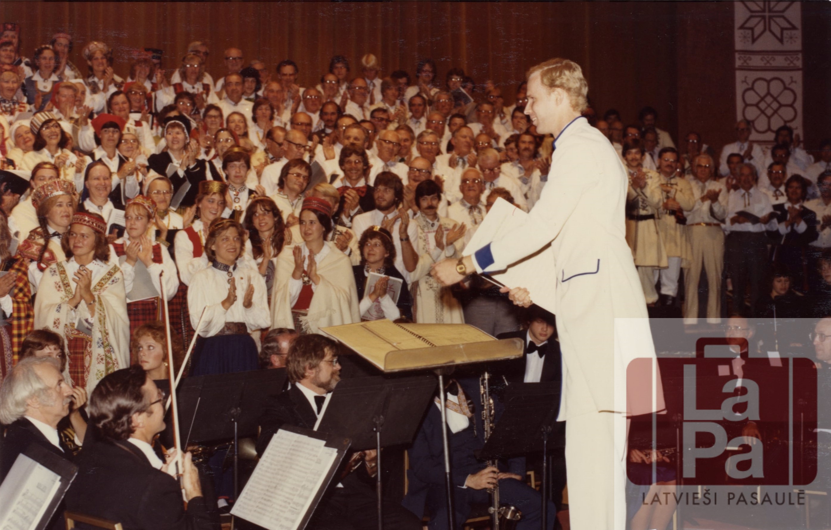 9. Rietumkrasta Dziesmu svētki Portlendā, Oregonā, ASV no 1982. gada 30. jūnija līdz 5. jūlijam. Imants Mežaraups un svētku kopkoris.