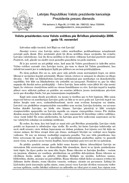 Valsts prezidentes runa Valsts svētkos pie Brīvības pieminekļa 2006. gada 18. novembrī
