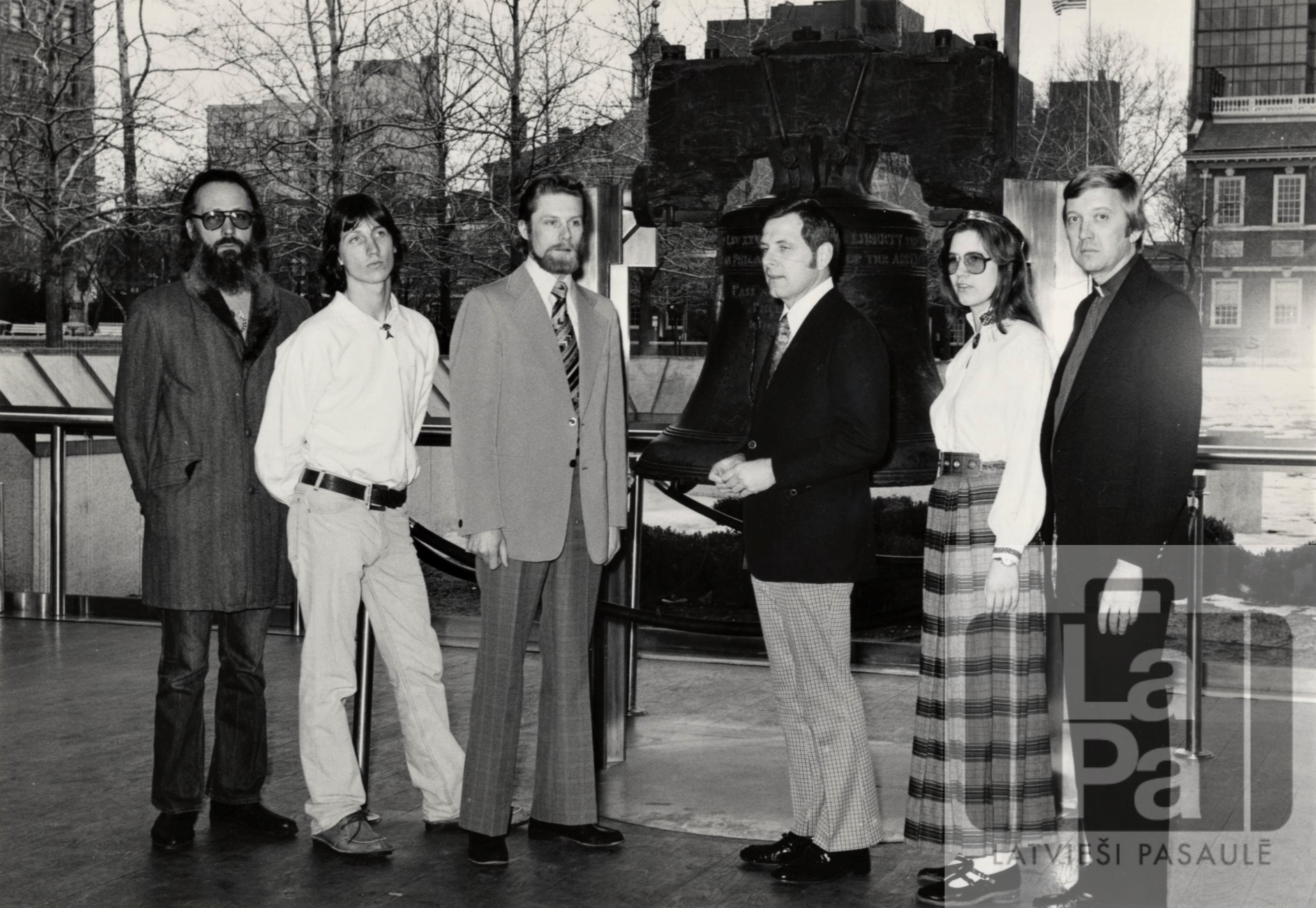 Vašingtonas 7' demonstrācija Vašingtonā 1976. gadā. Pie Brīvības zvana Filadelfijā. No kreisās: Modris Mednis, Vidvuds Mednis, Olafs Brūveris, nezināms, Laila Medne, mācītājs Māris Ķirsons.