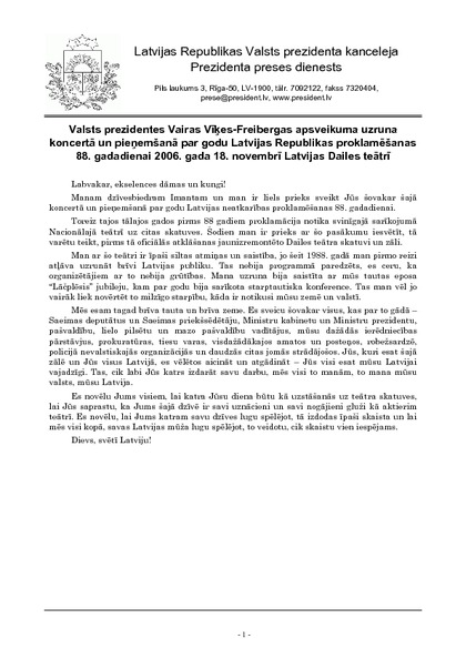 Valsts prezidentes Vairas Vīķes-Freibergas apsveikuma uzruna koncertā un pieņemšanā par godu Latvijas Republikas proklamēšanas 88. gadadienai 2006. gada 18. novembrī Latvijas Dailes teātrī