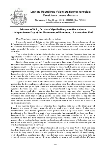 Address of H.E., Dr. Vaira Vīķe-Freiberga on the National Independence Day at the Monument of Freedom, 18 November 2006