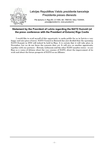 Statement by the President of Latvia regarding the NATO Summit (at the press conference with the President of Estonia) Riga Castle